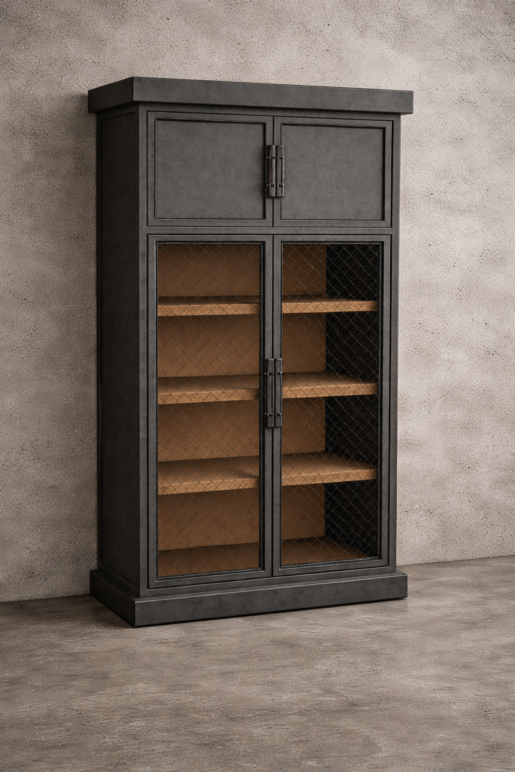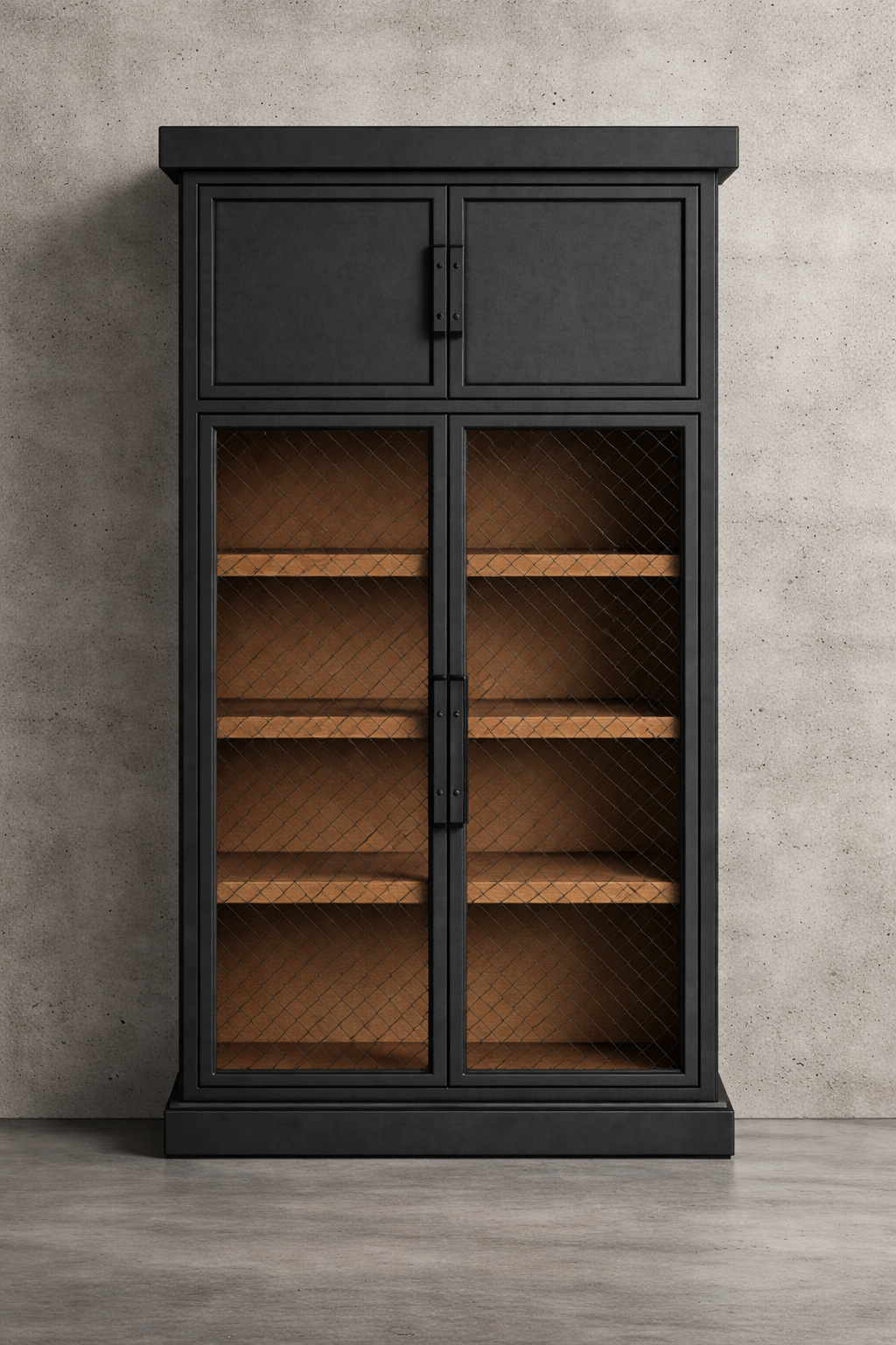 A black metal cabinet with upper solid doors and lower mesh panels. It features warm wood interior shelving and a sturdy, industrial design.