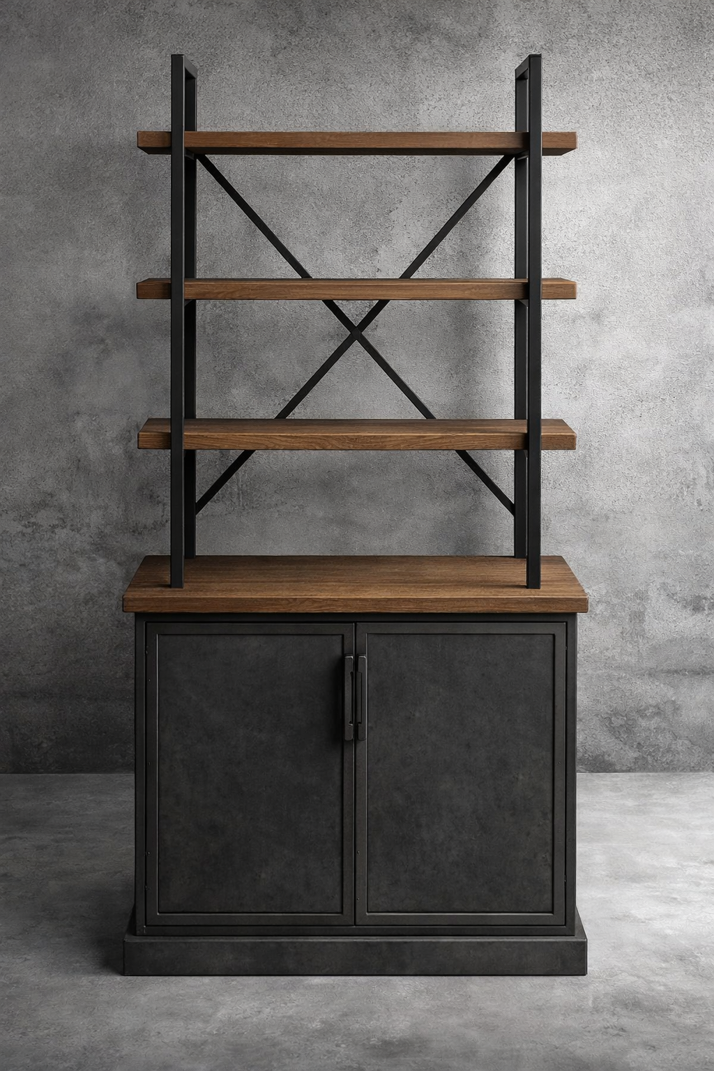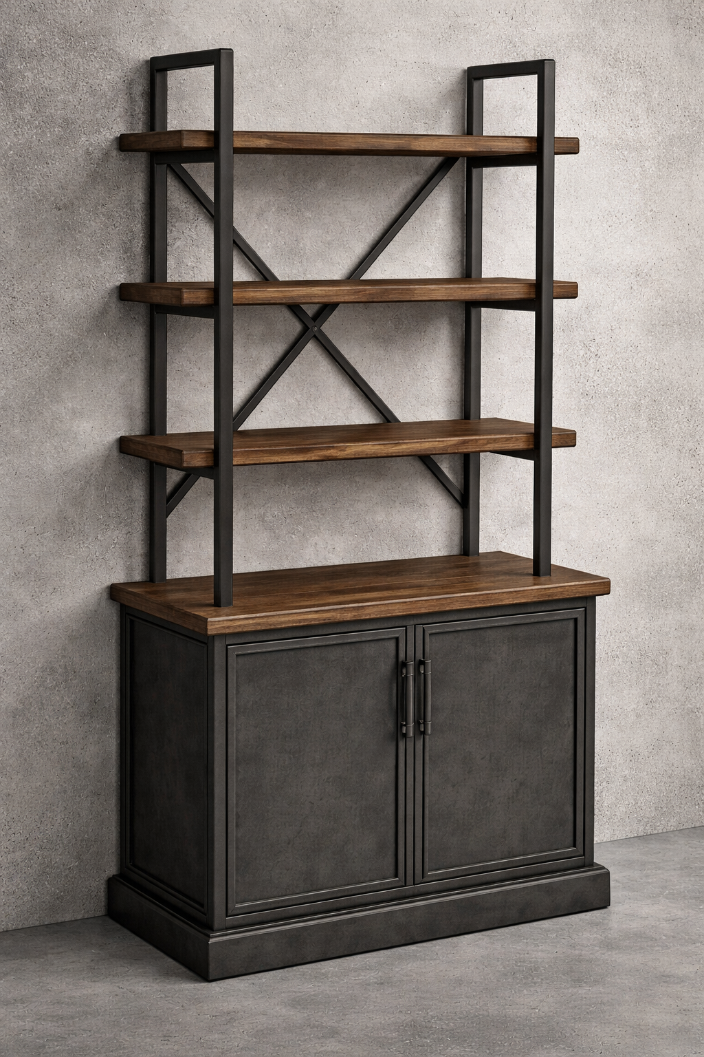 This storage piece features solid wood shelves supported by a sturdy metal frame. It pairs open shelving with enclosed cabinet storage for practical organization.