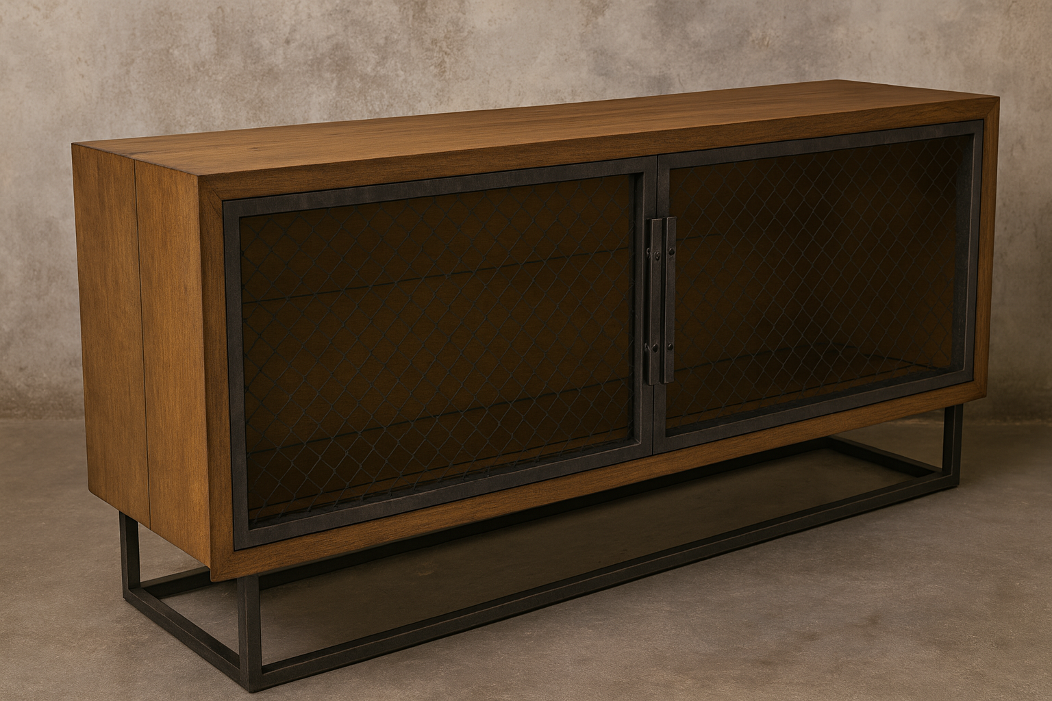 | Accent | Bread Boarding, Floating Top, Industrial Strap, Over Table Encasing, Rivets, Steel Top |