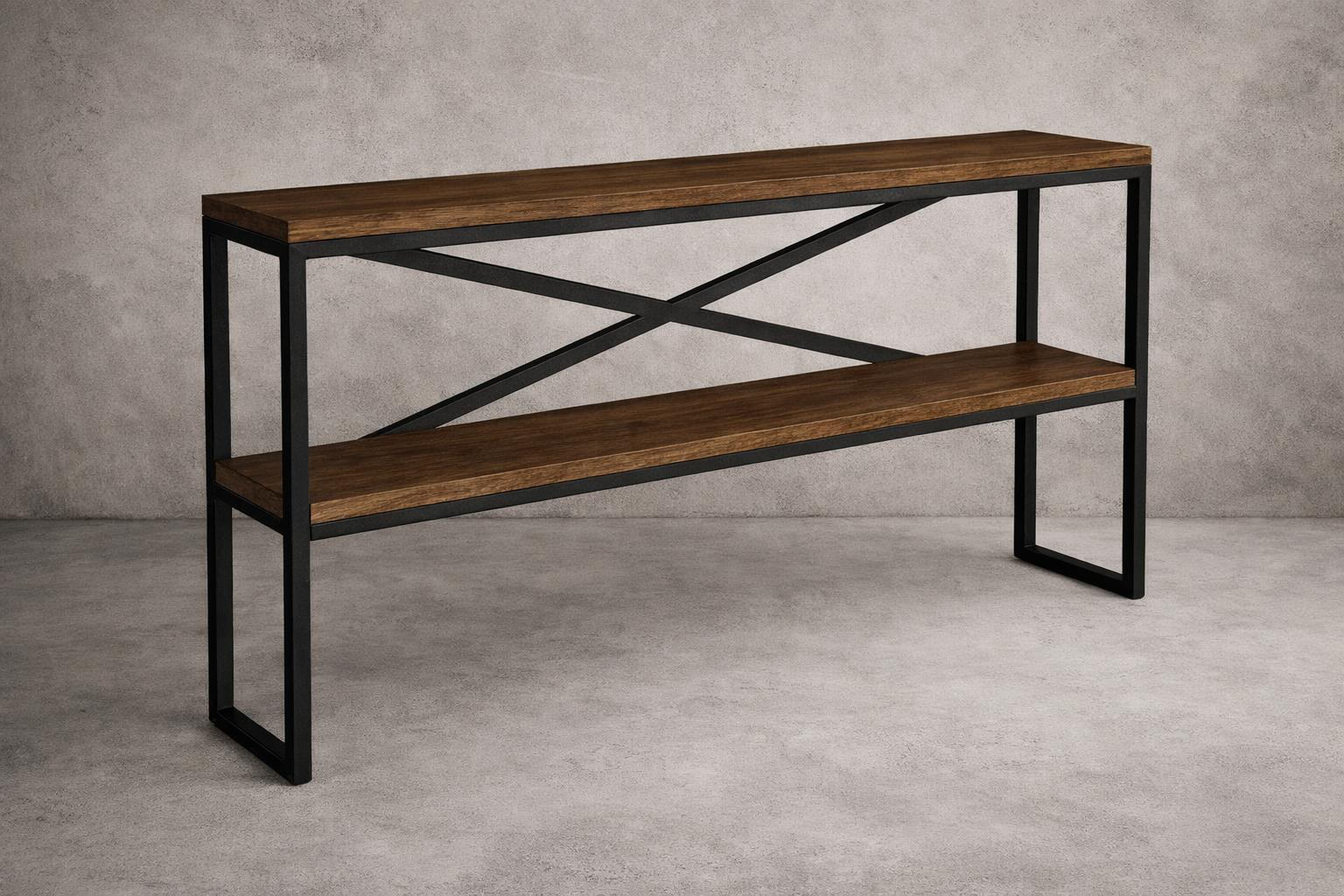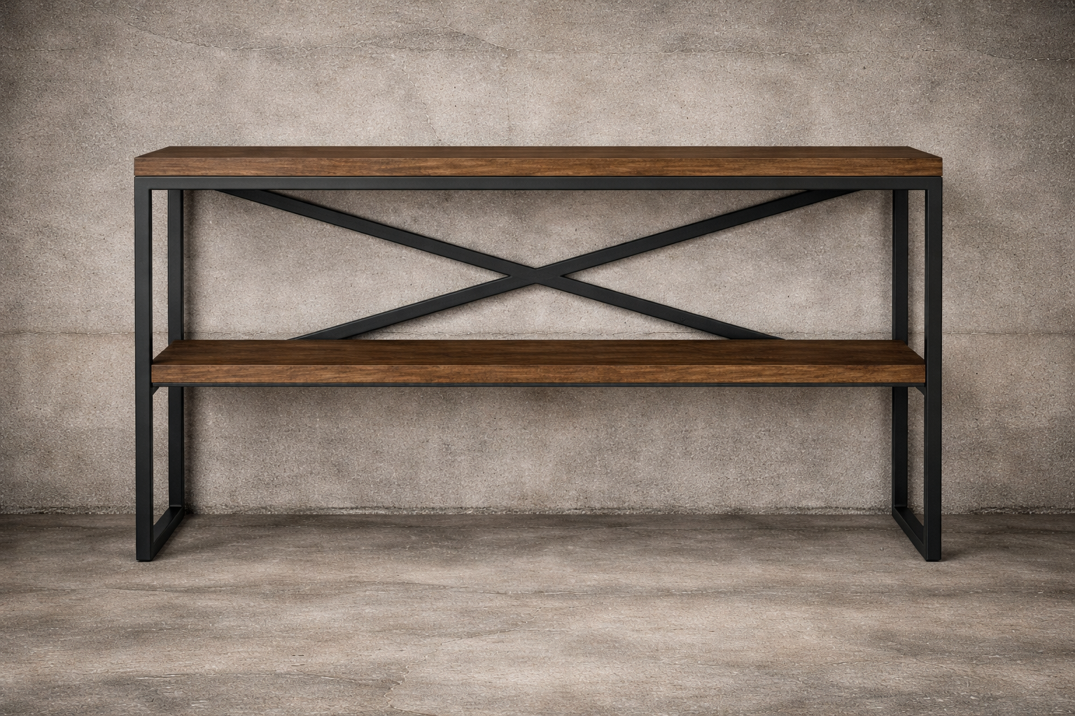 Bold cross-bracing adds visual strength while enhancing stability. The open lower shelf keeps storage accessible and the look clean.