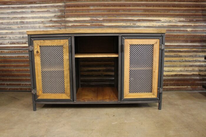 This console blends rustic charm with industrial flair, featuring a natural wood top, central open shelving, and two mesh-panel cabinet doors. Its sturdy black metal accents and warm wood grain offer both durability and contemporary style—perfect as a TV stand or versatile storage piece.