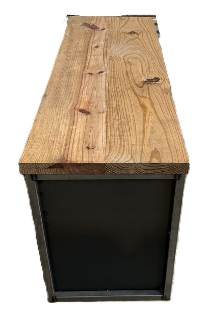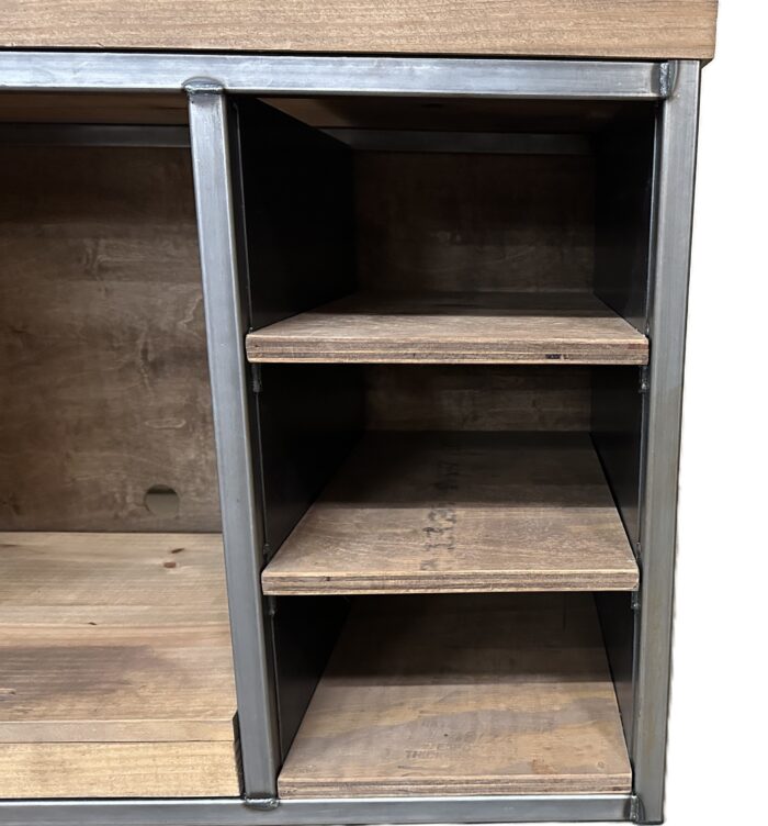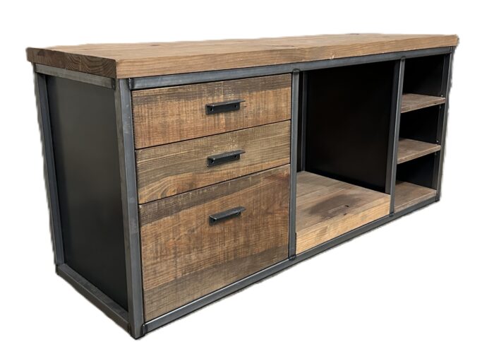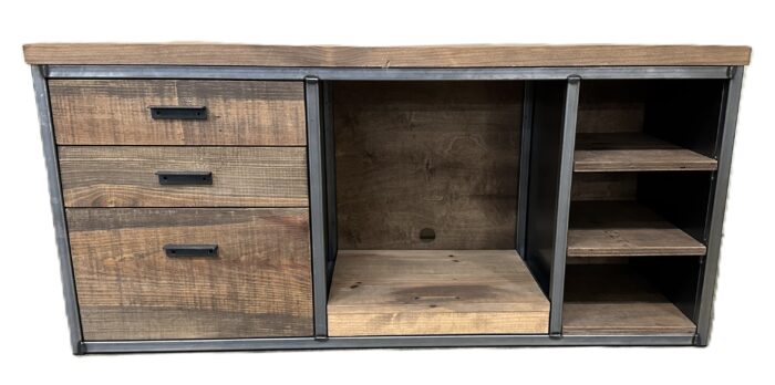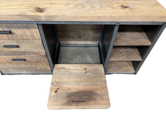 This industrial console features a rugged metal frame paired with rustic wood drawers and shelving for a stylish, functional design. With three spacious drawers, a central open area, and adjustable shelves, it offers versatile storage for any space.