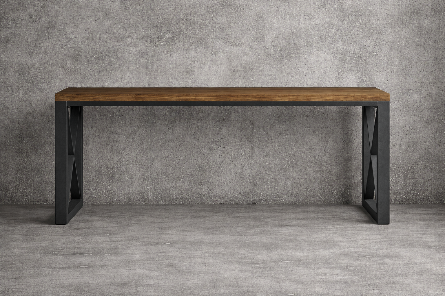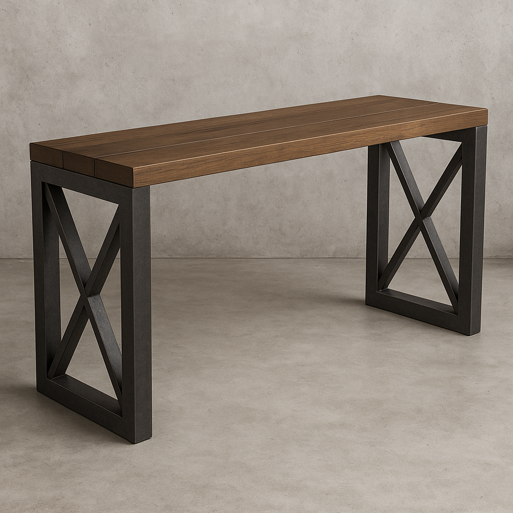 | Accent | Bread Boarding, Floating Top, Industrial Strap, Over Table Encasing, Rivets, Steel Top |