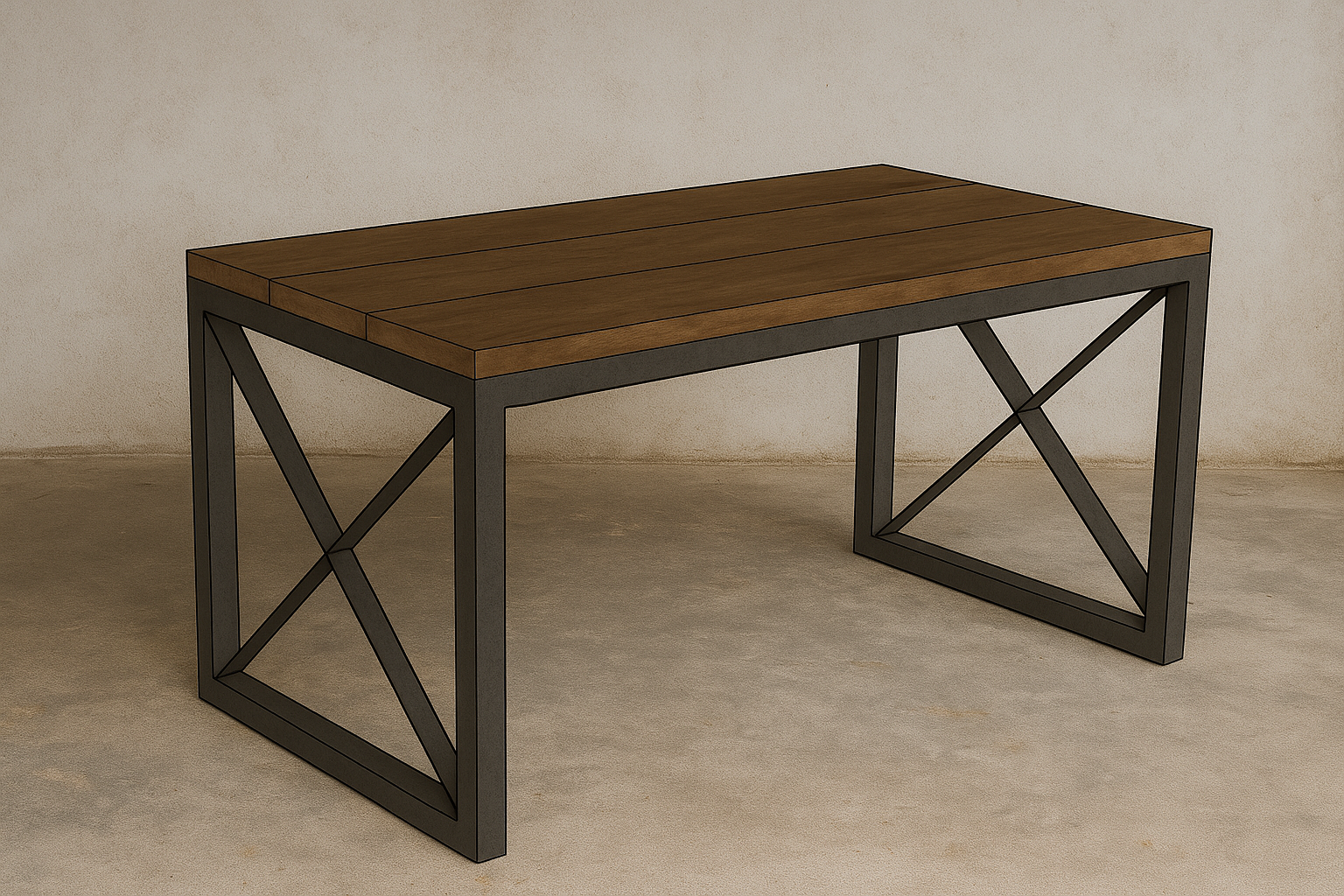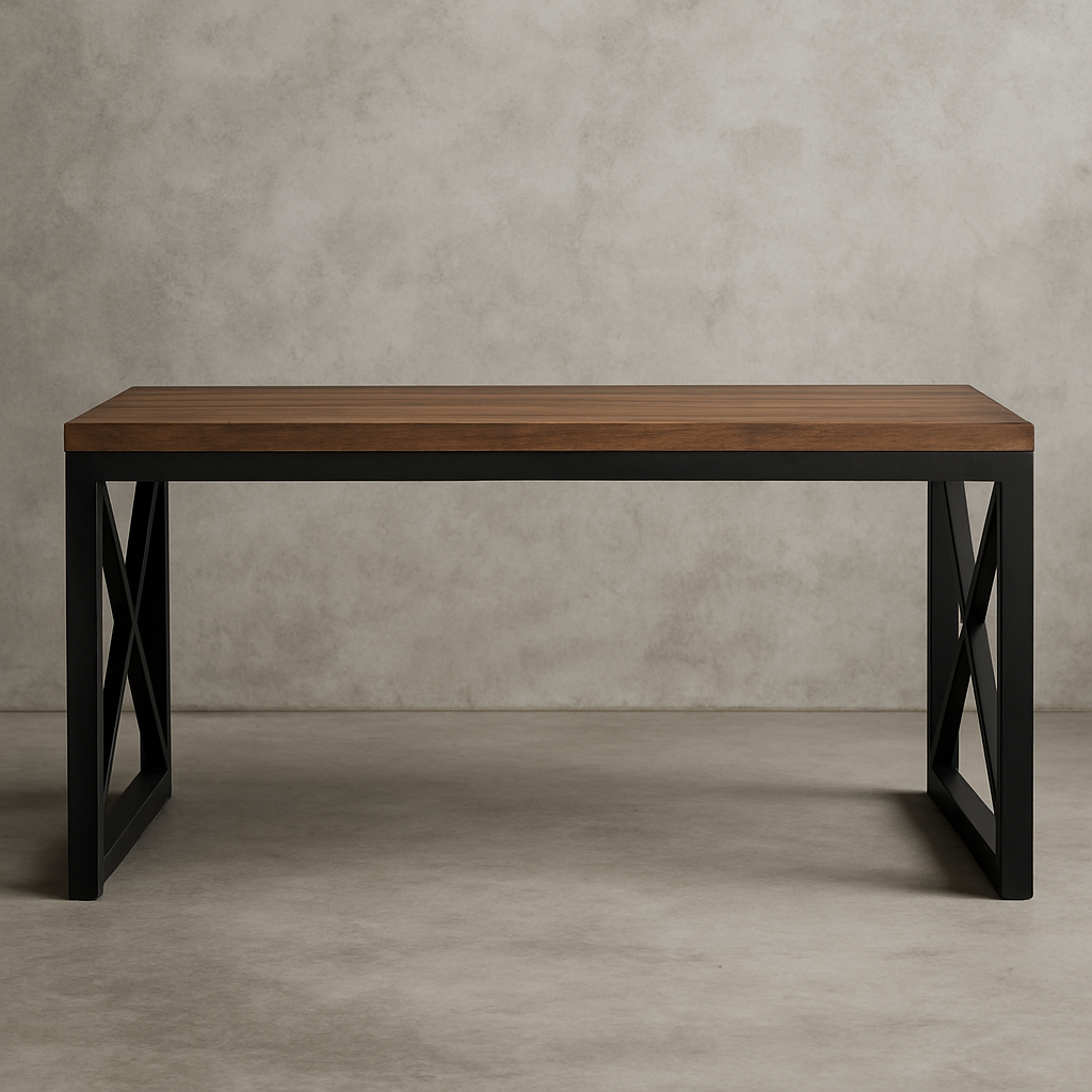 This desk features a sturdy metal frame with X-brace supports on each side for an industrial touch. Its clean wooden form keeps the overall look simple and modern.