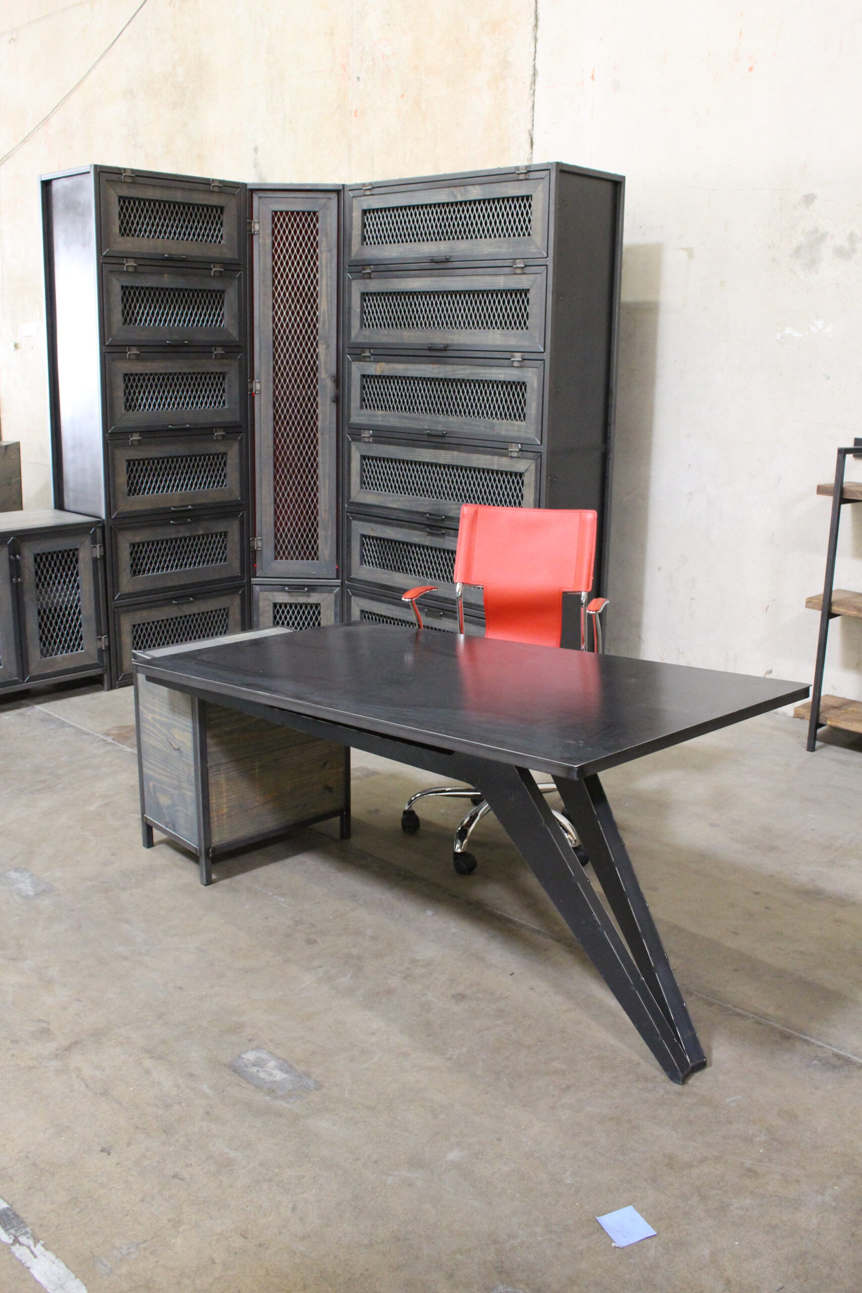 This piece features an angled support leg paired with a side-mounted drawer for a distinctive silhouette. A three-drawer cabinet on the opposite end adds balance and practical storage.