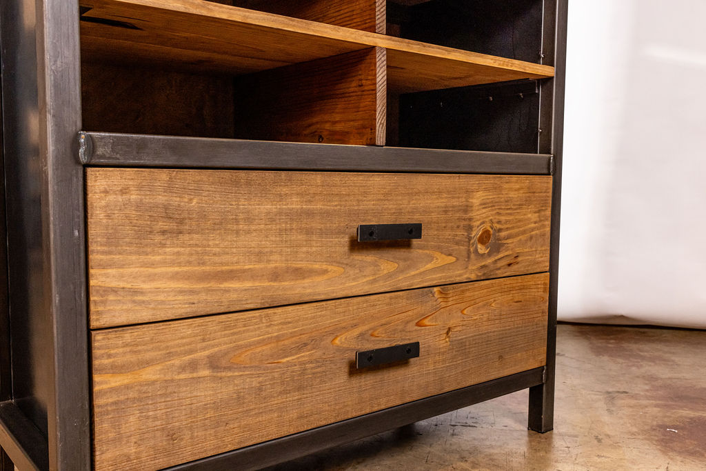 This contemporary industrial-style bookcase has a robust metal framework with wooden shelves, including two open upper shelves and a central section with mesh metal doors. The lower area features segmented storage compartments and two wooden drawers, ideal for organizing books, decor, or other items.