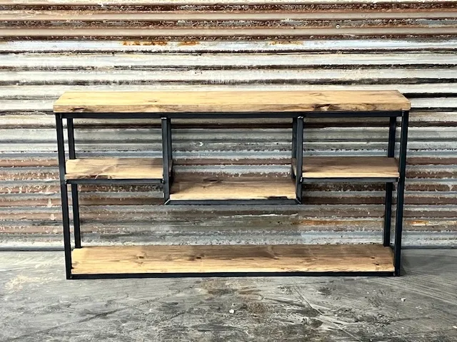 This console table showcases a robust black metal frame paired with walnut-stained wood shelves, seamlessly merging industrial and refined design aspects. Its open layout, featuring symmetrical shelving, not only promotes organization but also embodies a modern, minimalist style.