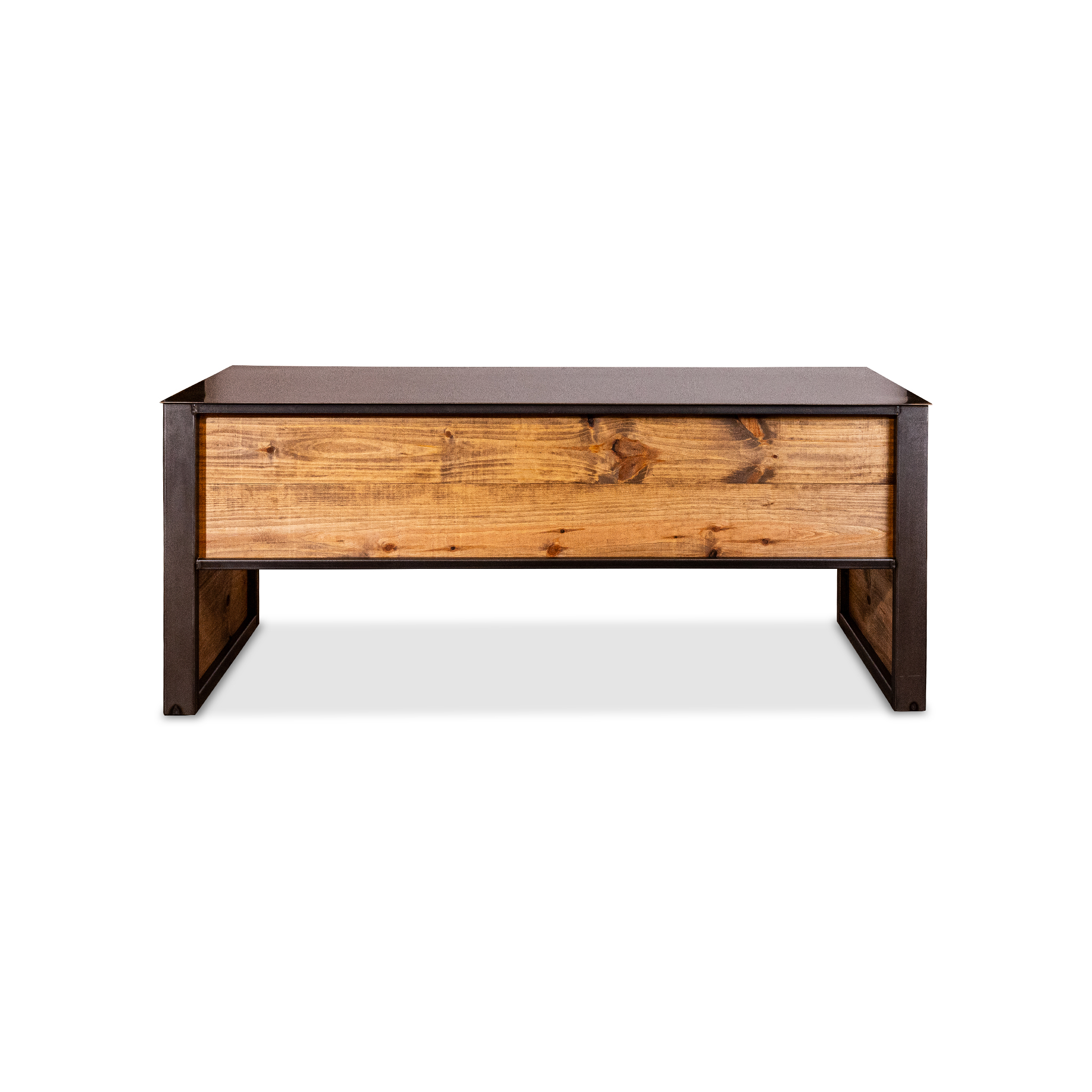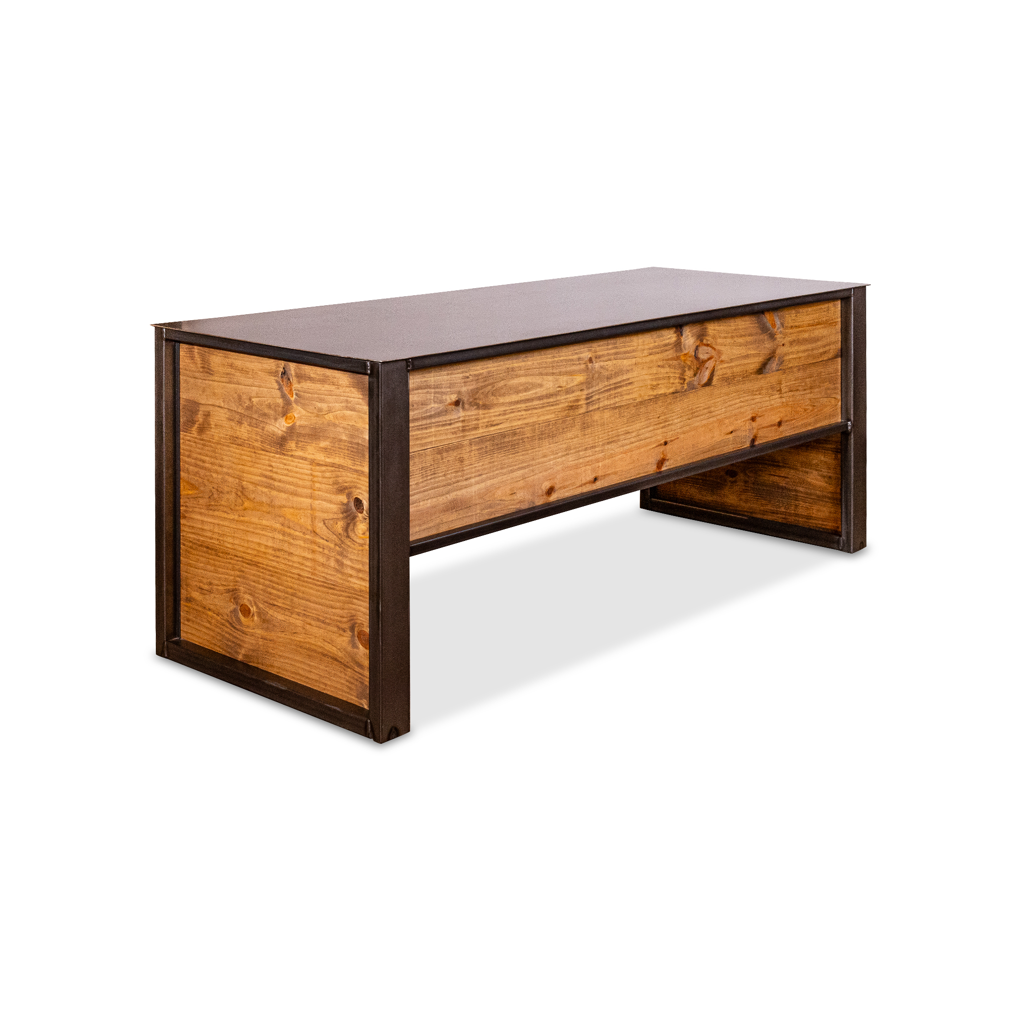 * Dark wood plank desk with metal frame
